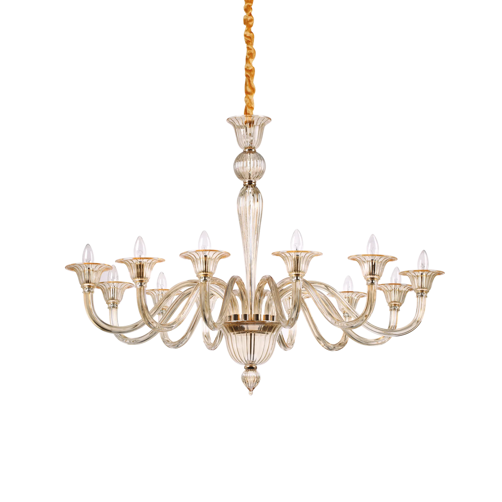 Lampadario in vetro soffiato ambrato, lavorato artigianalmente con montatura in metallo e copricatena in velluto.