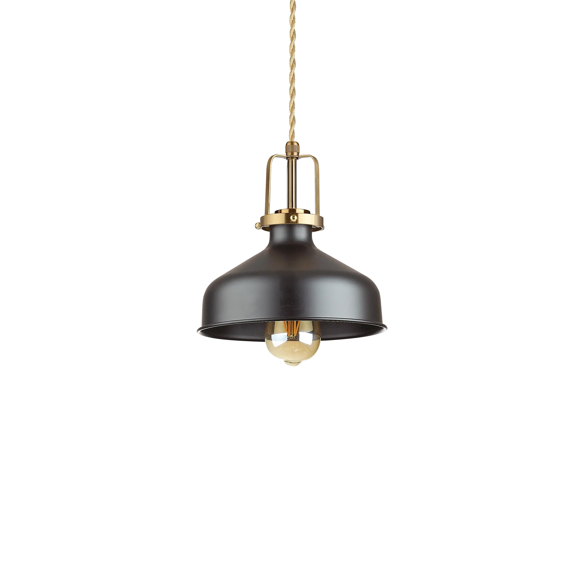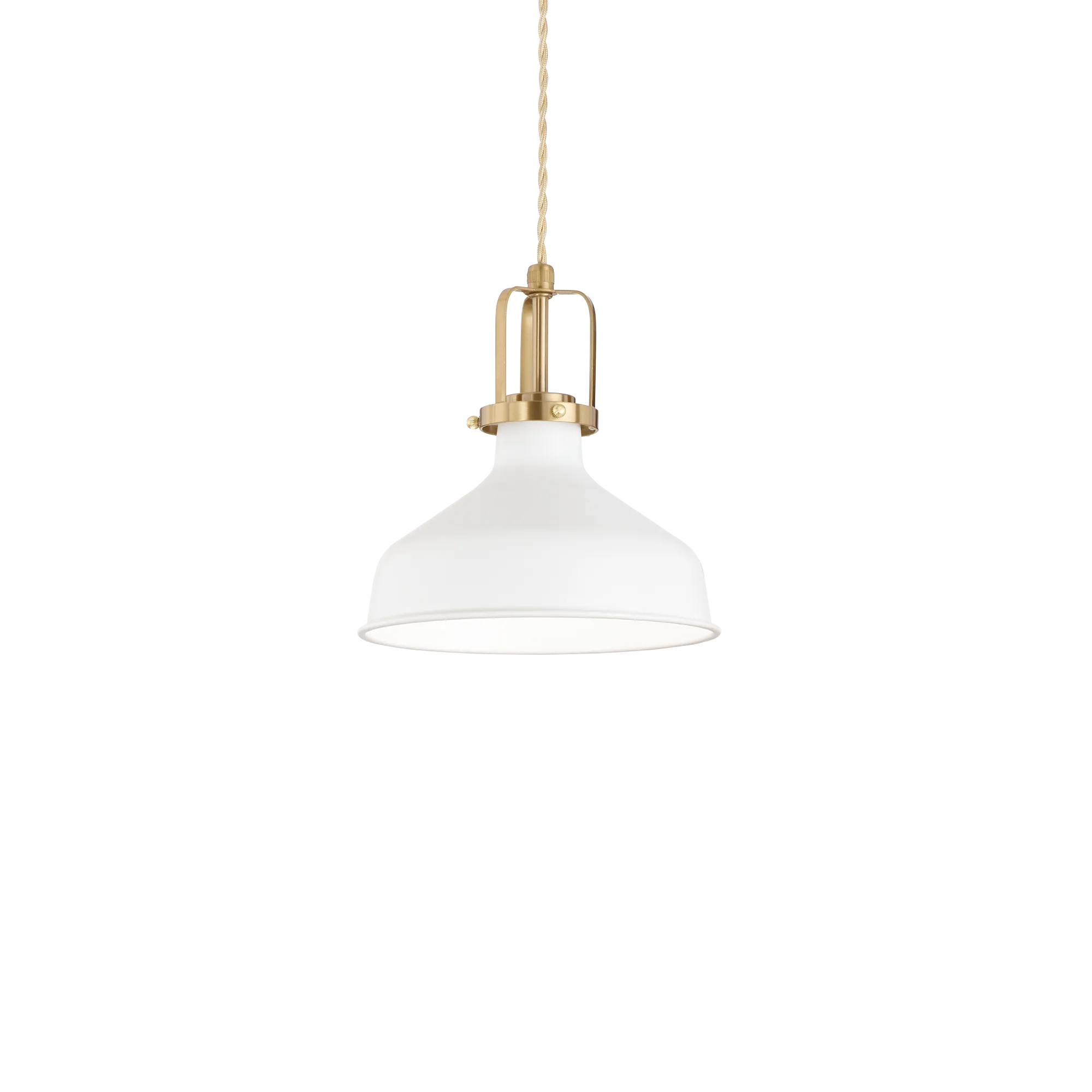 Montatura in metallo con rosone e diffusore verniciati bianco o nero opaco, dettagli in finitura oro satinato. Cavo elettrico intrecciato con rivestimento in tessuto. Le linee pulite ma ispirate alle vecchie fabbriche rendono queste lampade perfette per ambienti moderni, loft o cucine in stile rustico-contemporaneo. Particolarmente indicate per illuminare una penisola o un'isola centrale.