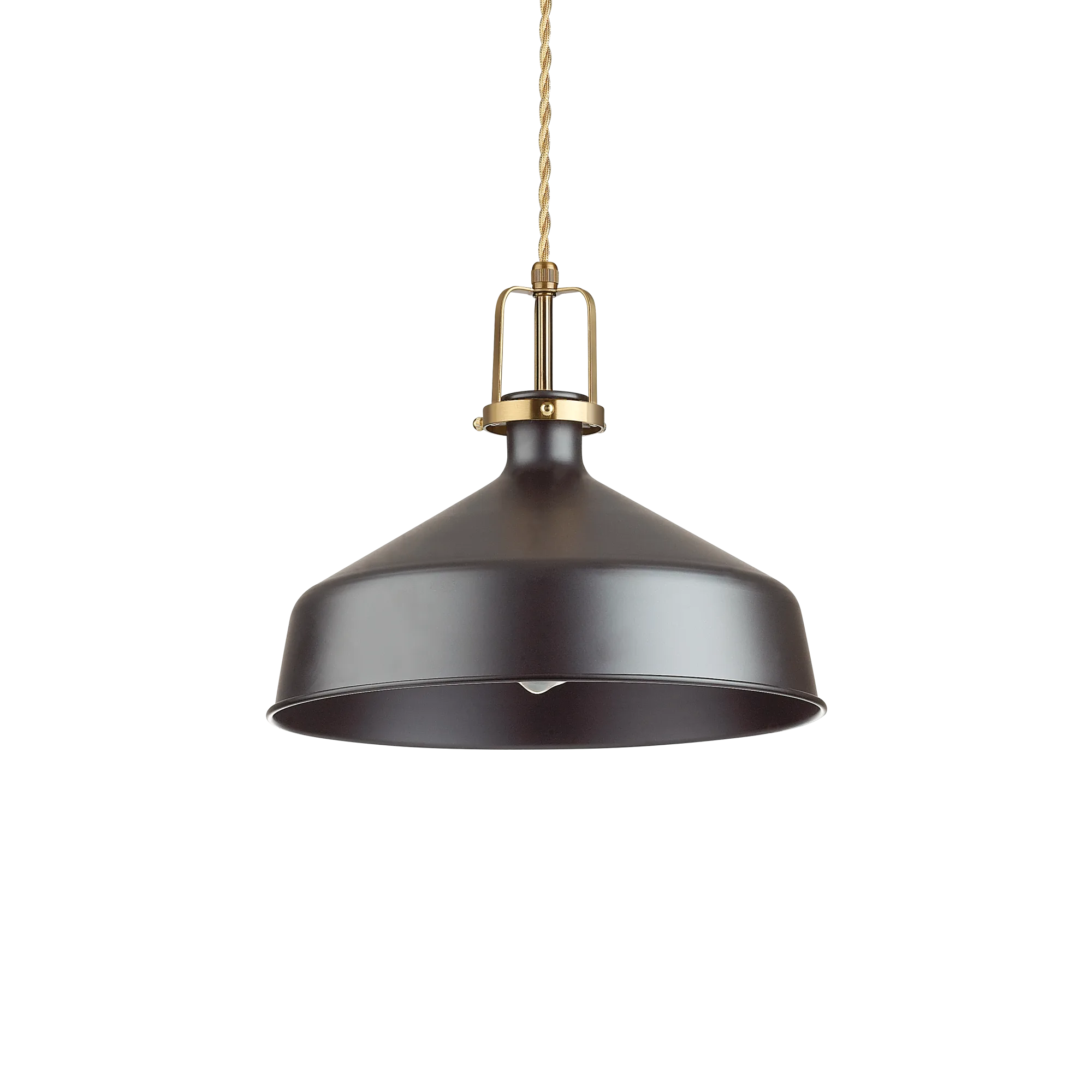 Montatura in metallo con rosone e diffusore verniciati bianco o nero opaco, dettagli in finitura oro satinato. Cavo elettrico intrecciato con rivestimento in tessuto. Le linee pulite ma ispirate alle vecchie fabbriche rendono queste lampade perfette per ambienti moderni, loft o cucine in stile rustico-contemporaneo. Particolarmente indicate per illuminare una penisola o un'isola centrale.
