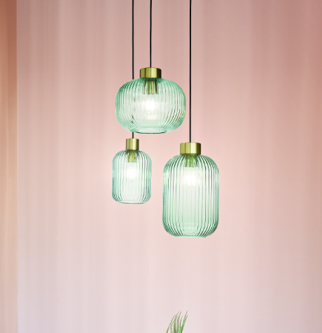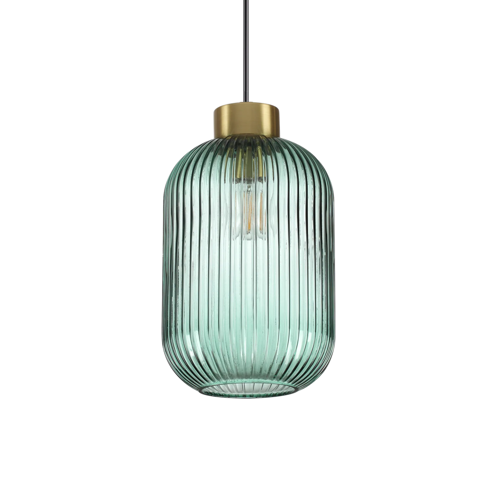 Montatura in metallo con finitura ottone satinato e rosone nero opaco. Cavo rivestito in tessuto. Diffusore in vetro soffiato con rigatura in rilievo. Disponibile nelle finiture fumee o verde. Perfetta per creare combinazioni, ottenendo un'illuminazione e un design unico.