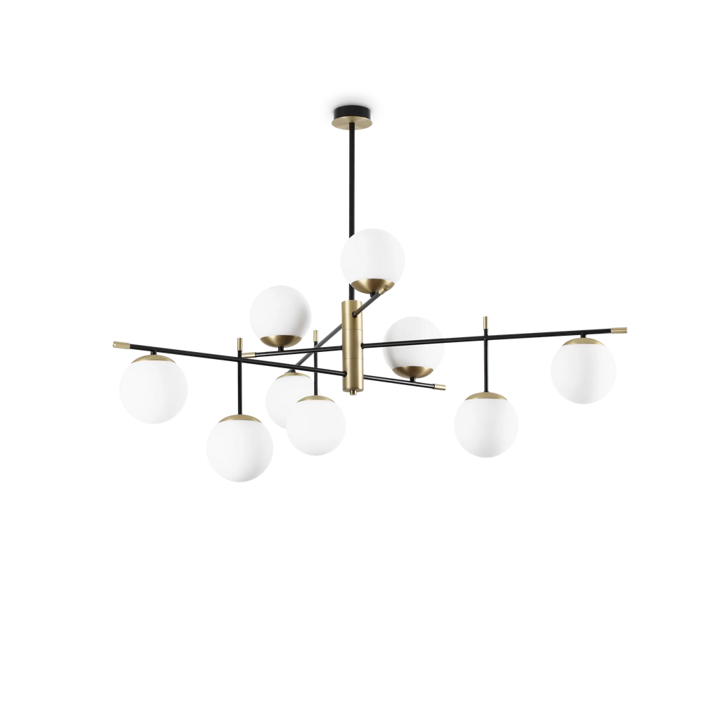 Plafoniera in metallo ottone nero 9 luci a forma di sfera vetro bianco