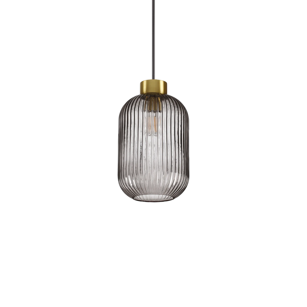 Montatura in metallo con finitura ottone satinato e rosone nero opaco. Cavo rivestito in tessuto. Diffusore in vetro soffiato con rigatura in rilievo. Disponibile nelle finiture fumee o verde. Perfetta per creare combinazioni, ottenendo un'illuminazione e un design unico.