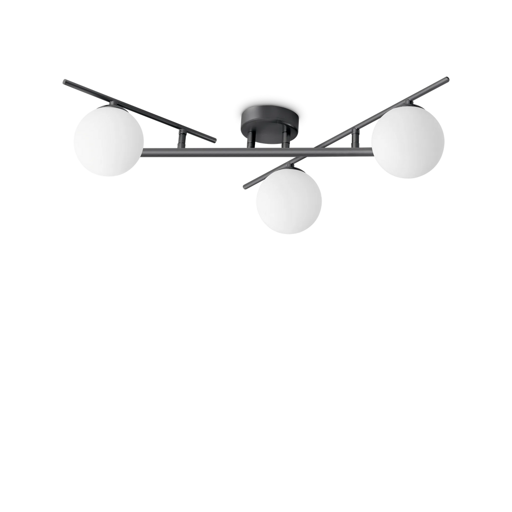 Montatura in metallo verniciato opaco con bracci posizionabili. Diffusori in vetro soffiato bianco acidato. Per cucina, salotto e camera da letto. La sua struttura in alluminio verniciato nero sostiene elegantemente sfere in vetro bianco, progettate per offrire una diffusione omogenea della luce.