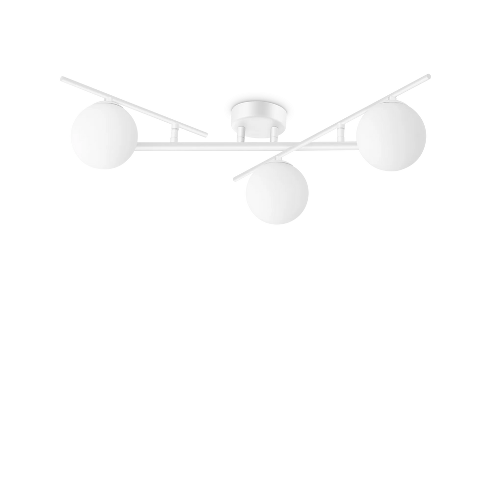 Montatura in metallo verniciato opaco con bracci posizionabili. Diffusori in vetro soffiato bianco acidato. La sua struttura in alluminio verniciato nero sostiene elegantemente sfere in vetro bianco, progettate per offrire una diffusione omogenea della luce.